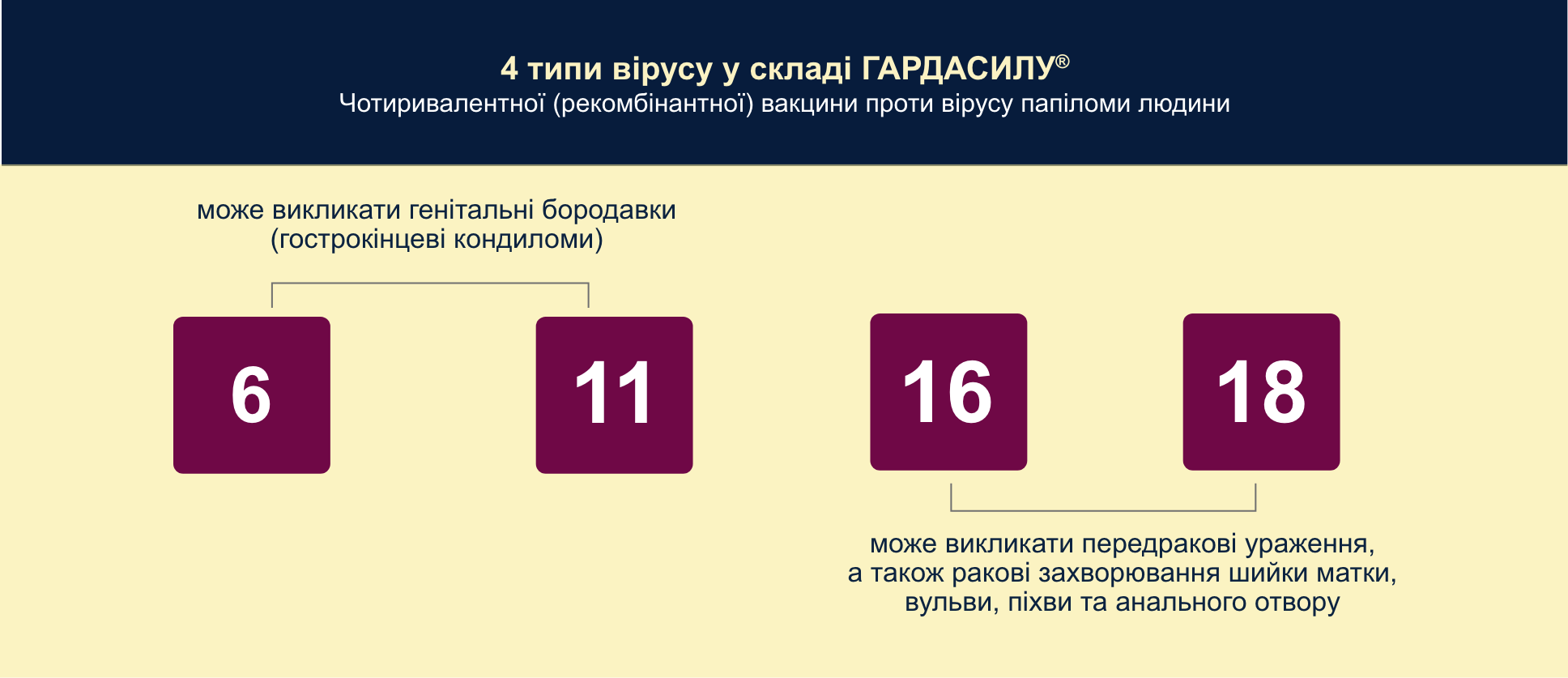 ГАРДАСИЛ® з високою частотою забезпечував* захист від 4 типів ВПЛ, попереджаючи розвиток захворювань, пов’язаних з ВПЛ.1